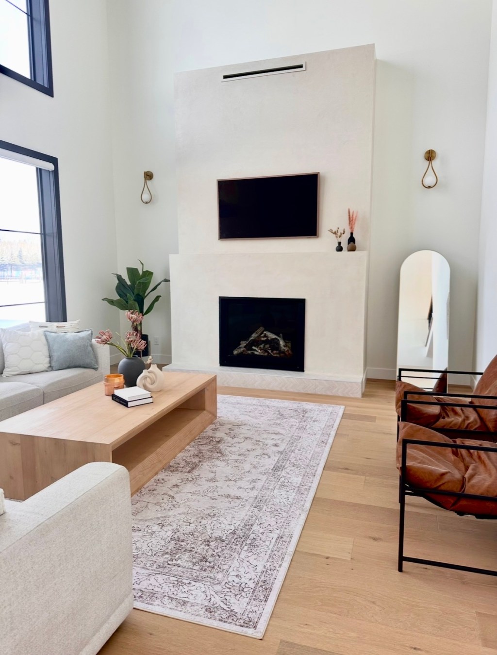 This room went from a concrete shell to our favourite place in the house. The combination of Sherwin Williams Alabaster walls, venetian plaster fireplace, warm wood tones, and carefully chosen decor creates exactly the modern farmhouse feel we dreamed of.